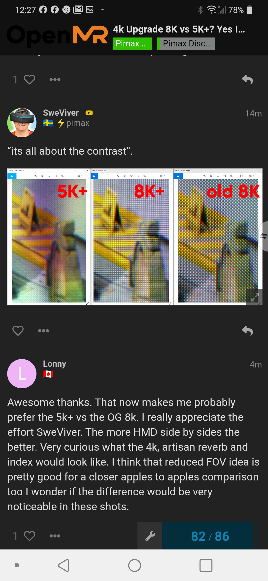 Awesome thanks. That now makes me probably prefer the 5k+ vs the OG 8k. I really appreciate the effort SweViver. The more HMD side by sides the better. Very curious what the 4k, artisan reverb and index would look like. I think that reduced FOV idea is pretty good for a closer apples to apples comparison too I wonder if the difference would be very noticeable in these shots.