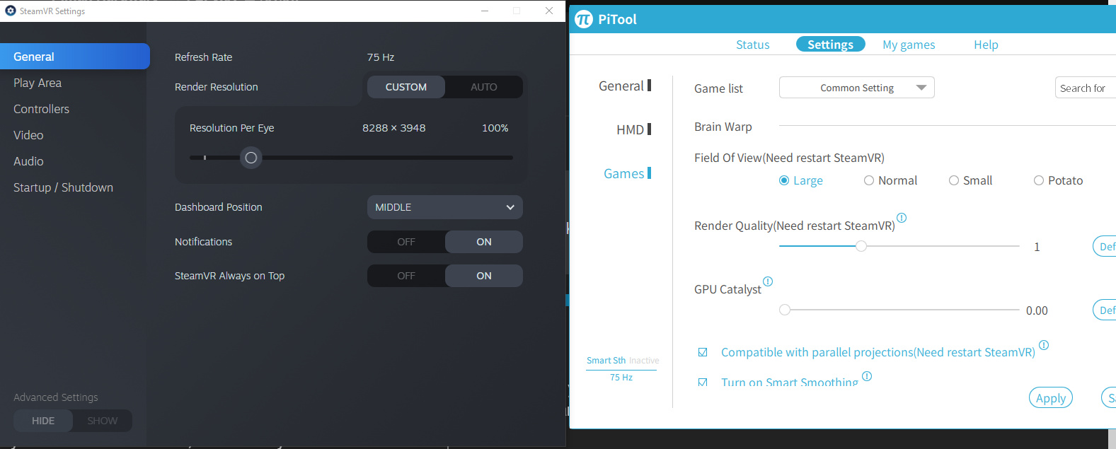 Dont you see the difference? And then you start moving these sliders up and down with no visible change, and your fps is not changing. Still dumb users doing sh1t? Or maybe its just pitool being not very userfriendly doings its own sh1t? Or maybe its steamvr with his limitations by default which not everyone knows about? It takes time understand this things and its not possible if we dont try and dont discuss this.