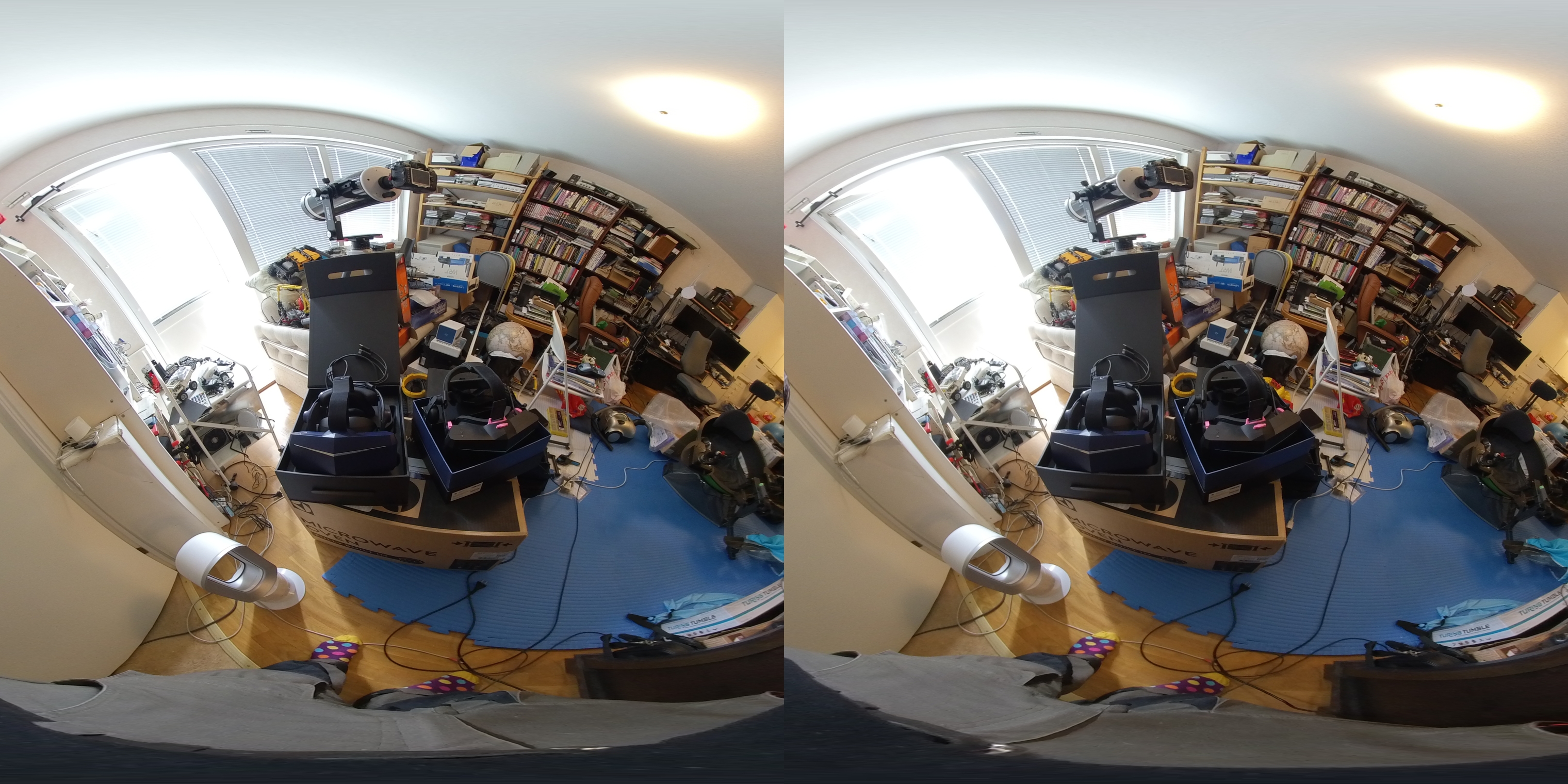 Back to the 8K X itself. It has a blue rubbery casing, and silvery wedge and buttons. The power button still did nothing in SteamVR; I’d love to rebind it as a system button. Pimax Home and SteamVR both render neatly. I can only resolve the pixels in part of the display (central), but be aware I’m a bit of a resolution geek; I found the iMAX cinema to use silly low resolution, and think my 27" 2560x1440 monitors are just acceptable at arm’s length. “Screen door effect” is not technically eliminated, but in practical terms no longer a factor of concern. I can just tell there is a raster, and it would be surprising otherwise; 2160 is a big number but still not a match for human vision. I could still tell some aliasing based creeping in the periphery in Pimax Home.