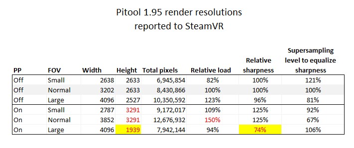 It’s also unclear when you need to restart which tool. Based on my experience it’s mostly safe to assume that any change in Pitool (FOV, render quality, parallel projections) that affects the rendered image requires a SteamVR restart to take effect.
