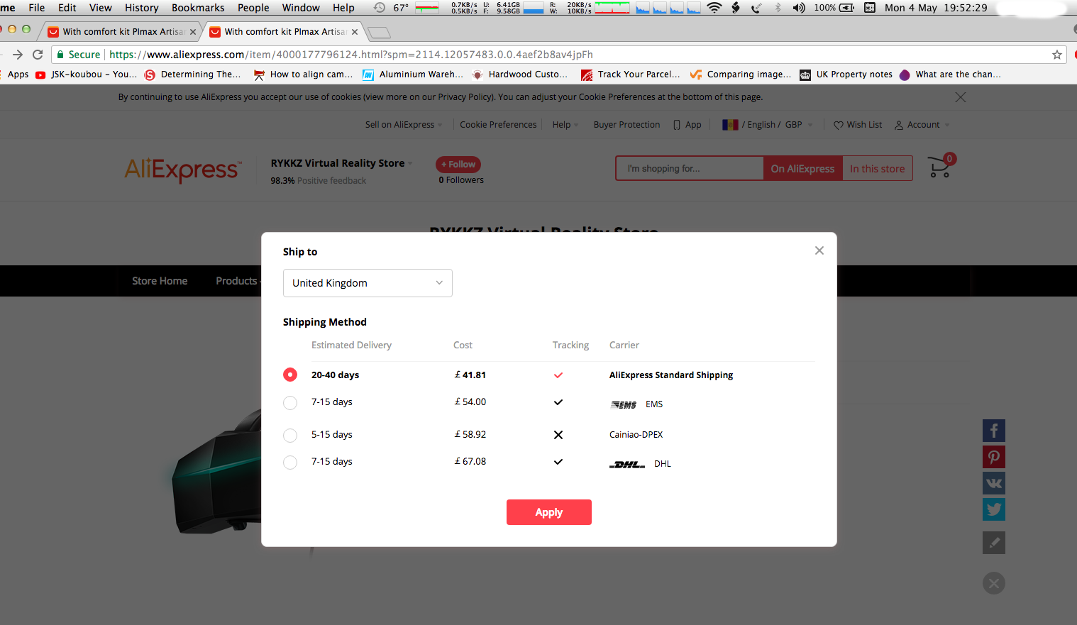 It’s getting complicated for me. A couple of days ago I ordered another one this time using DHL postage as I had a feeling that the first one I ordered would never arrive. I raised a dispute with Aliexpress and they seem to be agreeing that I should get a refund on the first so hopefully that will be the case (not quite sure what happens if it turns up - I don’t want to rip anyone off so will send it back unless they tell me otherwise). Interestingly RYKKA sent me a message this morning saying that they had contacted the ‘post office’ and have been told that all parcels are only being flown using domestic passenger airlines and there arn’t that many at the moment - so there’s the problem! So why are they STILL saying delivery in 7-15 days is what I find really bad. Anyway, although apparently they have 13 in stock they haven’t sent the new one out yet!!!
