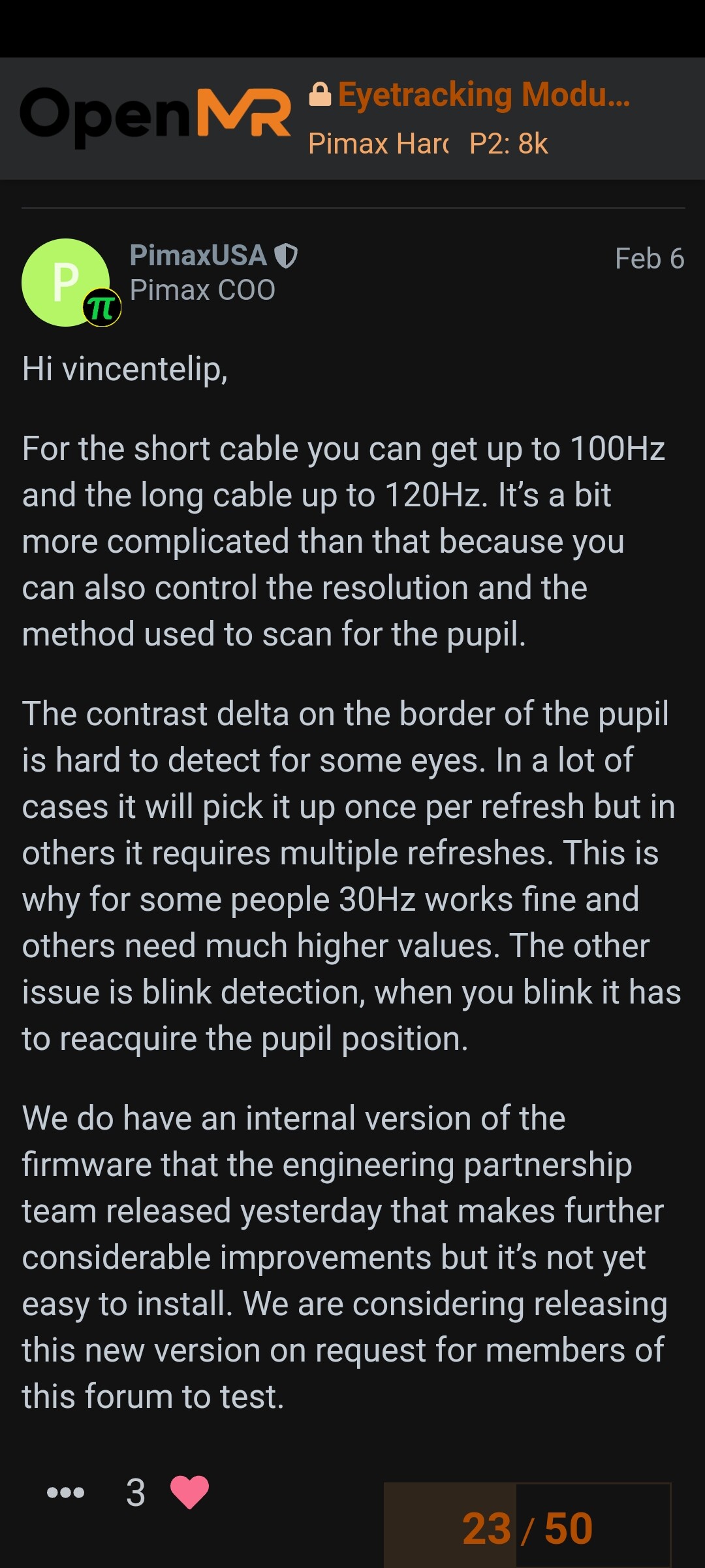 I removed the eye tracker myself, no matter what software improvements are implemented the physical device is terrible and cant be fixed. The added glare may not be noticeable to some people but for me its completely disqualifying. The magnets are terrible and the eye tracker fell out of its place every time I put the headset on. The lenses are so close to me now my eye lashes run against them even after doubling my foam thickness. To top it all off the actual eye tracking wasn’t very good.
