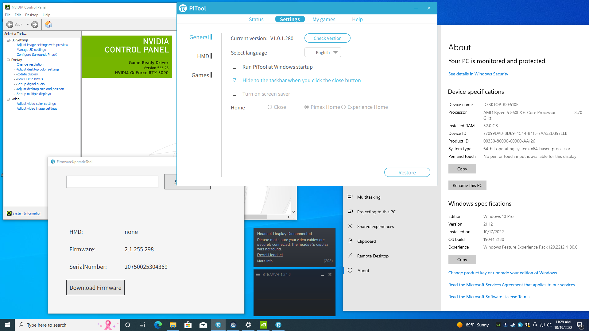 The headsets do connect via USB and show up in the DFU.exe with their serial numbers and firmware versions properly. Here is a schreenshot with all the pertinent version information for the Windows install, PiTool, Nvidia drivers, SteamVR and one of the 8KX’s.