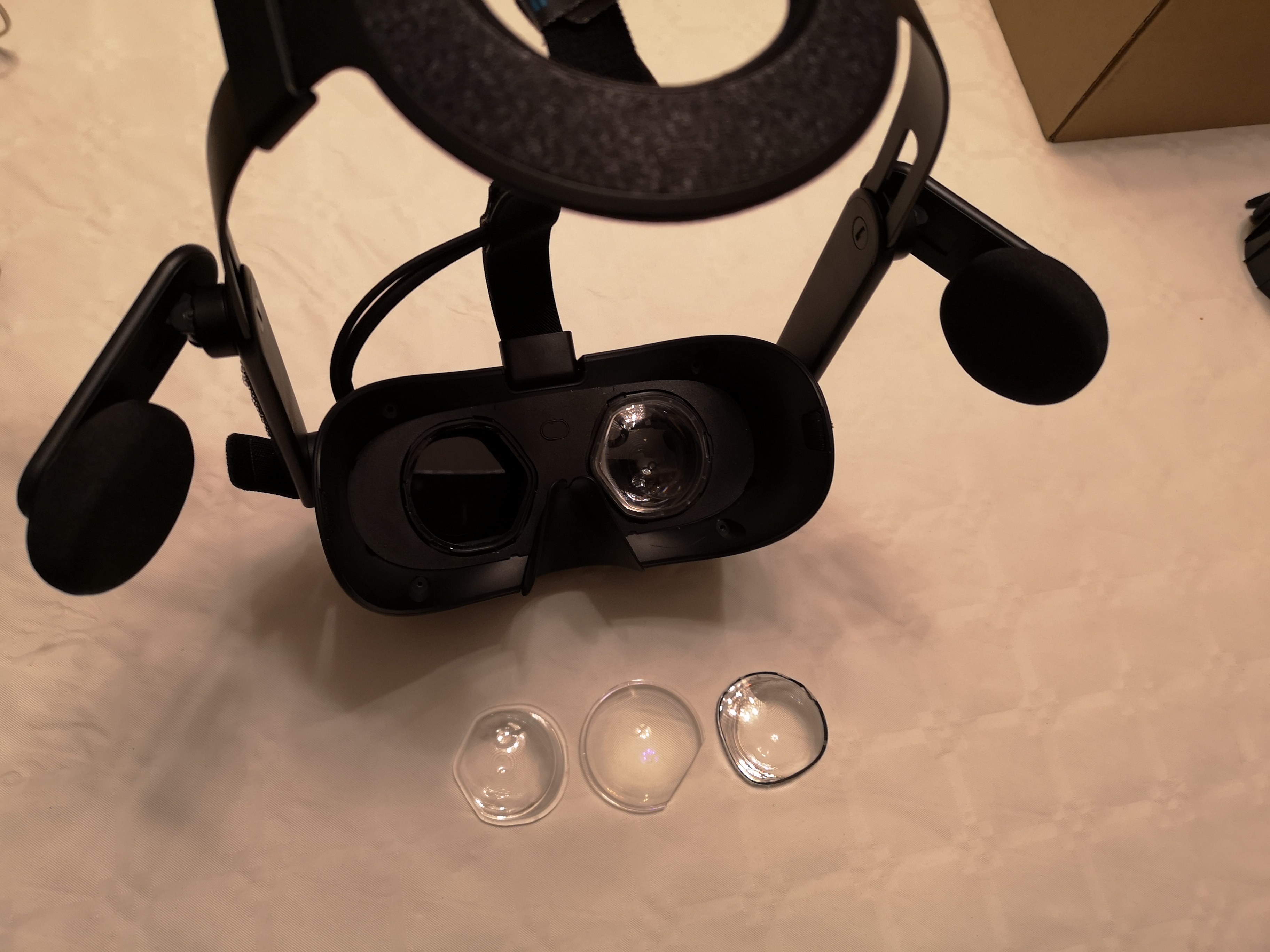 A closer image. Look at the fresnel rings of the Reverb (left) and Rift S (right). Pimax 4K lenses are aspherical (not fresnel) and do not have rings. Not to be confused with the weave of the tablecloth. Look at the middle rings of the Reverb lenses.