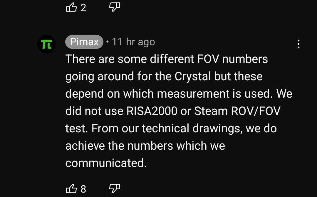 Yeah, this statement is pretty daft - essentially it tells the prospective customers that Pimax sort of very deliberately choose to use their own measurement from technical drawings, which leaves it completely in the dark as to how this is done, meaning they could has claimed 150 or 200 degrees of FoV, doesn‘t matter, you have no clue how they measure it anyhow.