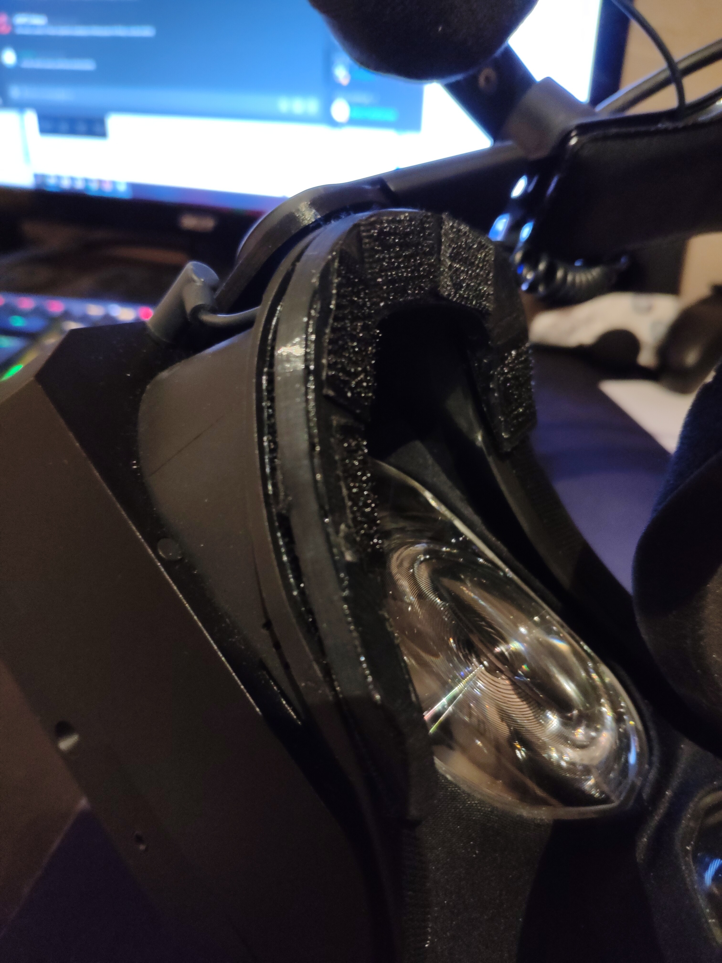 This for me is much more comfortable - however, like the straps that come with the Pimax, because the HMDs themselves are SO wide, the hinges are attached really far apart, which means the DAS speakers will JUST make it to my ears, and stay put, without springing back out. The reason is the because the HMD is just so wide.