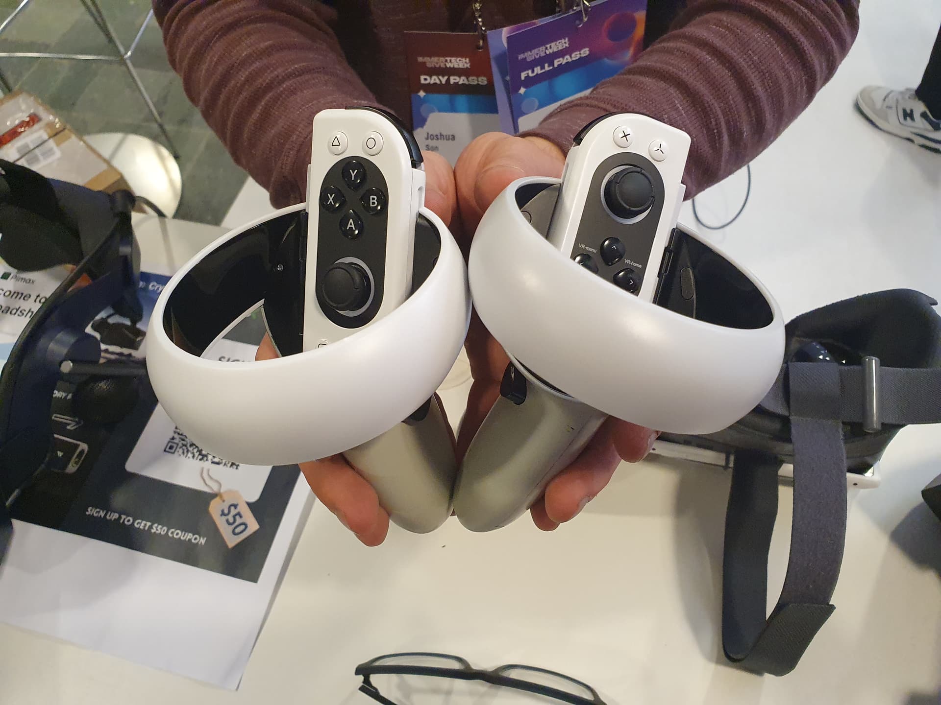The controllers were there and charging but I didn’t get to try them as it wasn’t actually the official event time etc. Hopefully will try them tomorrow. They feel decent enough. I guess inbetween the feel of Quest 2 controllers and reverb g2 controllers in terms of build quality. They do indeed have hall effect sensors which seriously Pimax deserve credit for. I am convinced that other companies don’t use them just so they can keep selling more controllers as they break, the material cost for hall effect can’t be that significant. Joshua mentioned that PS vita uses hall effect thumbsticks which just backs up my suspicions as they couldn’t have whole units fail but replacable controllers are just fine ha.