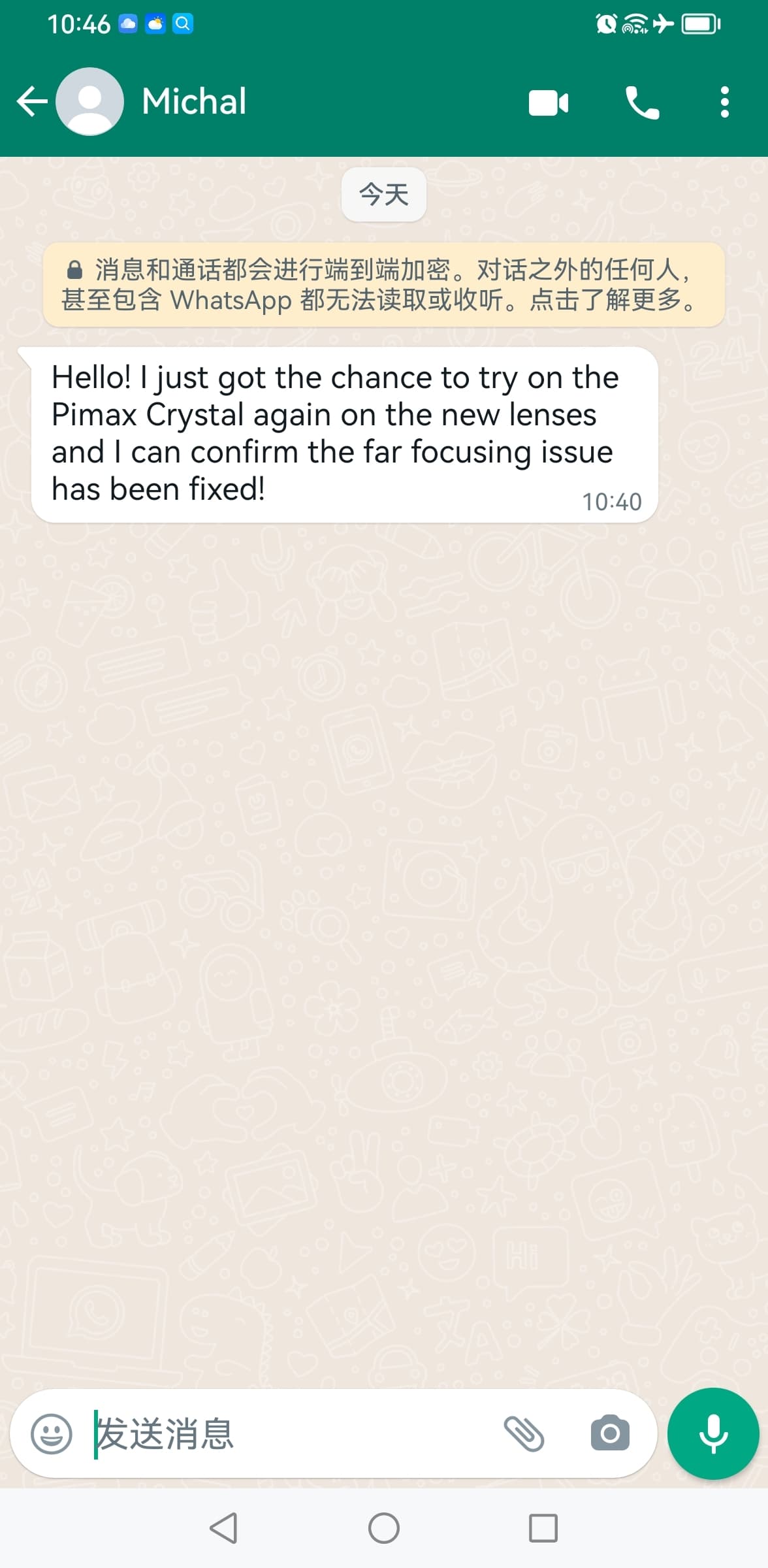 In order to address the focal plane issue we have performed some comparative verifications. Our R&D team quickly confirmed the source of the issue. In our original design, due to the excessive consideration of some people with basic myopia, and with the hope of ensuring visual acuity for people with normal vision, the distance from the crystal lens to the screen was reduced by 2mm compared with the standard. Next, we will adjust the height of the lens bracket to make it more suitable the average 20/20 vision. We are already correcting the length of the lens barrel to adjust the focal plane to the standard distance.