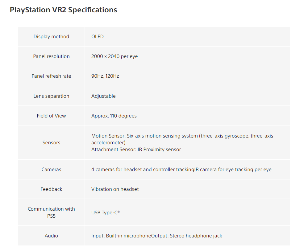 Included Eye tracked foveated rendering, On headset haptic feedback, inside out tracking, connects to PS5 via 1 USB-C