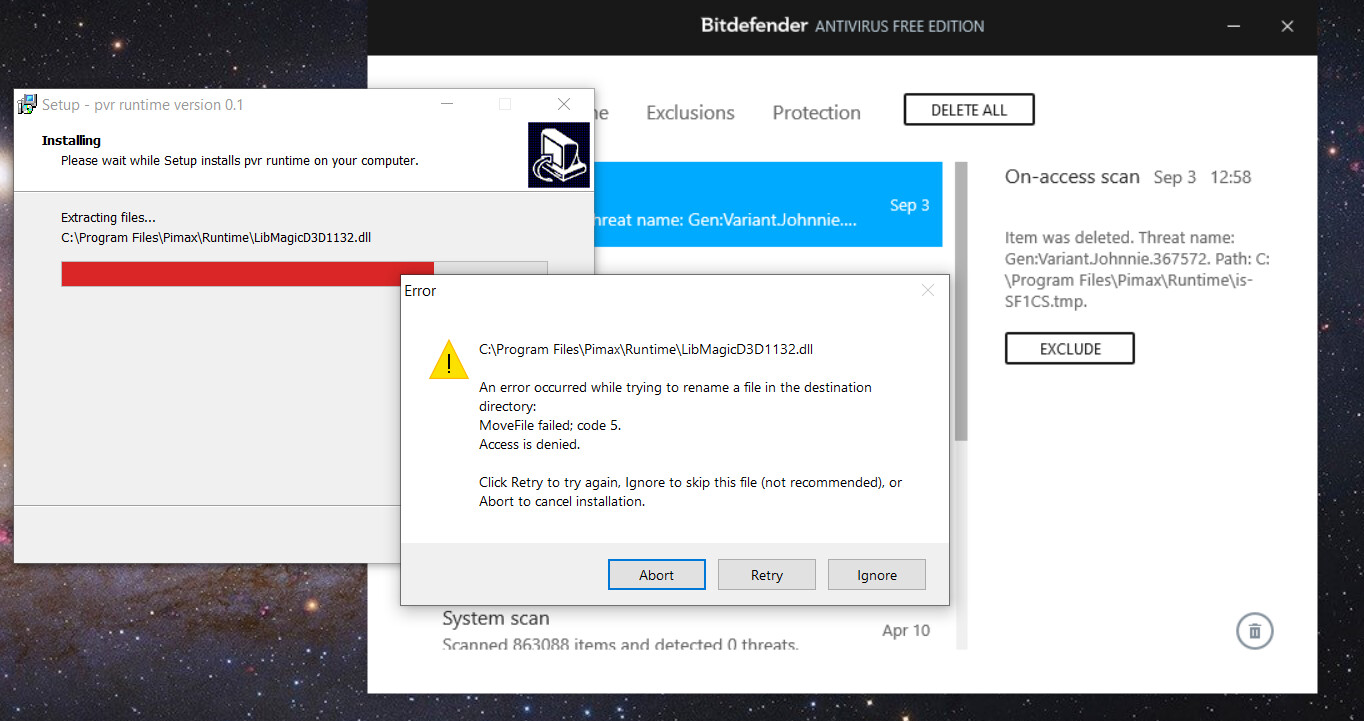 I had to temporarily except the whole \Pimax\Runtime\ folder to get 270 to install. But now that’s done, things seem to be working normally again.