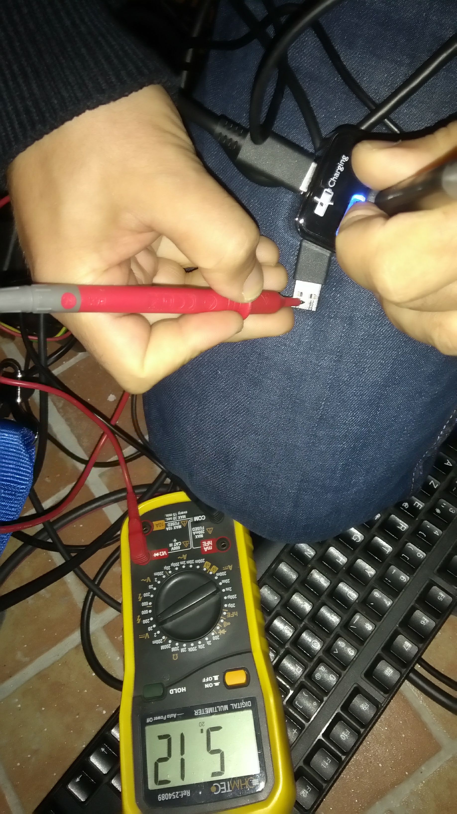 Okay so you seeing 0.12 volt excess being supplied on one or both USB headers from your AC mains. I have no idea what the tolerances are for the 8KX, I would not expect 0.24 volts to exceed the power limits. This only confirms that your power supply is okay, now yank the DP cable out from the HMD and measure the resistance from the power rail of the DP cable to each of the USB headers.