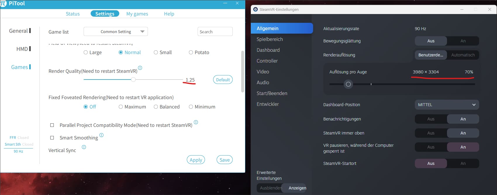 I just recognized, that the resolution which is shown in steamvr is set to 3804x3160. I havent changed anything in the Pitool. Field of View is set to normal, render quality is 1.0. Parallel Projection, smart smoothing, hidden area are all off.