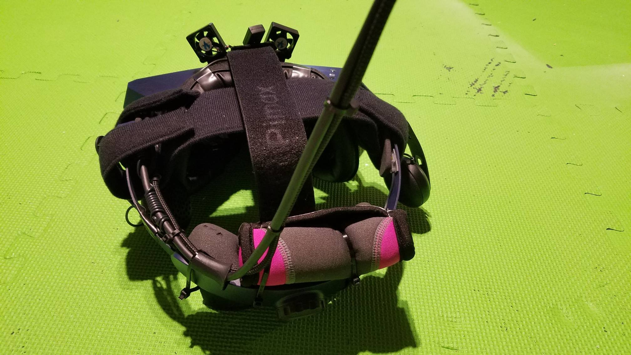 Also, here are some pictures of the headset with all of my mods. Vive audio, VR and Chill fans, apache strap, VRmust face foam taped to the original thin foam for extra padding and distance and VRmust prescription lens inserts, 1lb counterweight. I’m using a dogleash pully system and Club3D 3m displayport extension for the cords. The second cable is a USB cable to power the fans since I don’t want to power it off of the headset and potentially effect tracking.