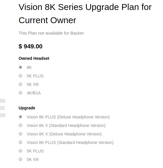 Wow this is such a great deal. As a backer I want to go back in time and not back the kickstarter, then I do not have to worry about turning in my stretch goals for basically -$100 off (Vision 8K PLUS (Standard Headphone Version is 849.00 for non backers, backer $700 + 100 credit for down grade, +$150 free eye tracking & other stretch goals=$950)