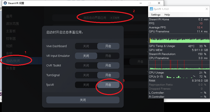 2,先右键单机桌面右下角steamvr图标,点设置,出现下图,再按顺序123点击即可