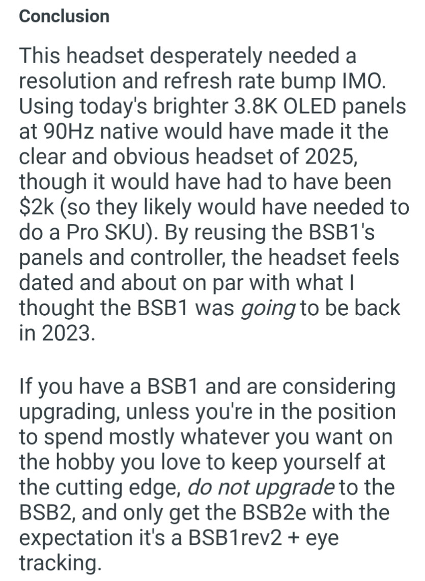 Background: I’m coming from a BSB1. I’ve owned many VR headsets including multiple exotic expensive ones and have a great deal of experience with VR. I considered the BSB1 to be the best headset on the market as it unexpectedly replaced my other headsets as my main when I got it. For me, the biggest weakness of the BSB1 was the glare. Second biggest weakness was needing to keep eyes forward. Since the BSB2 was claimed to address both of these, I ordered it instantly when it was announced on March 20th.